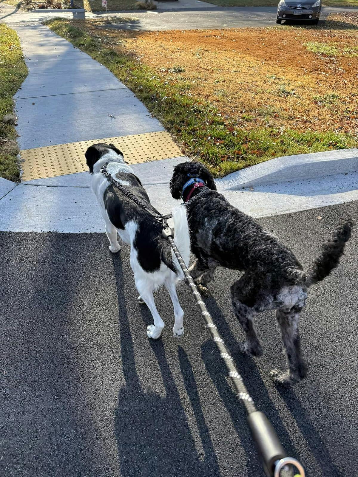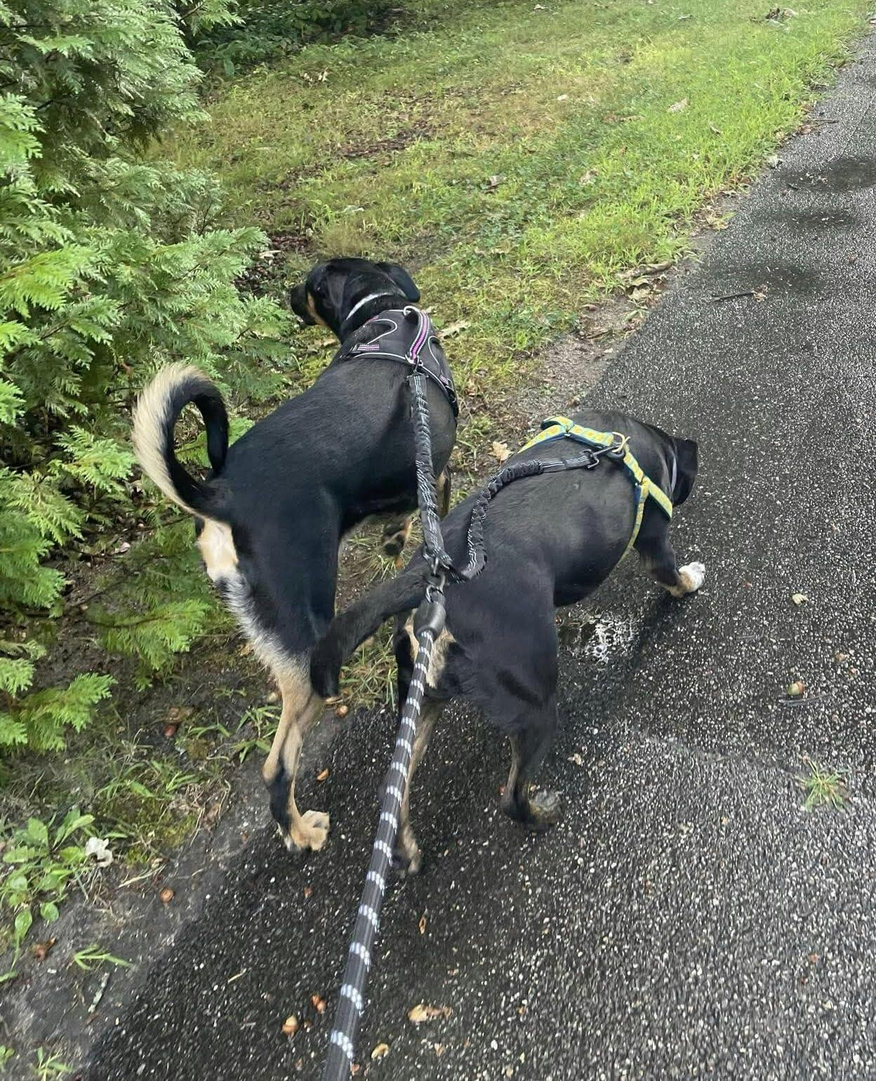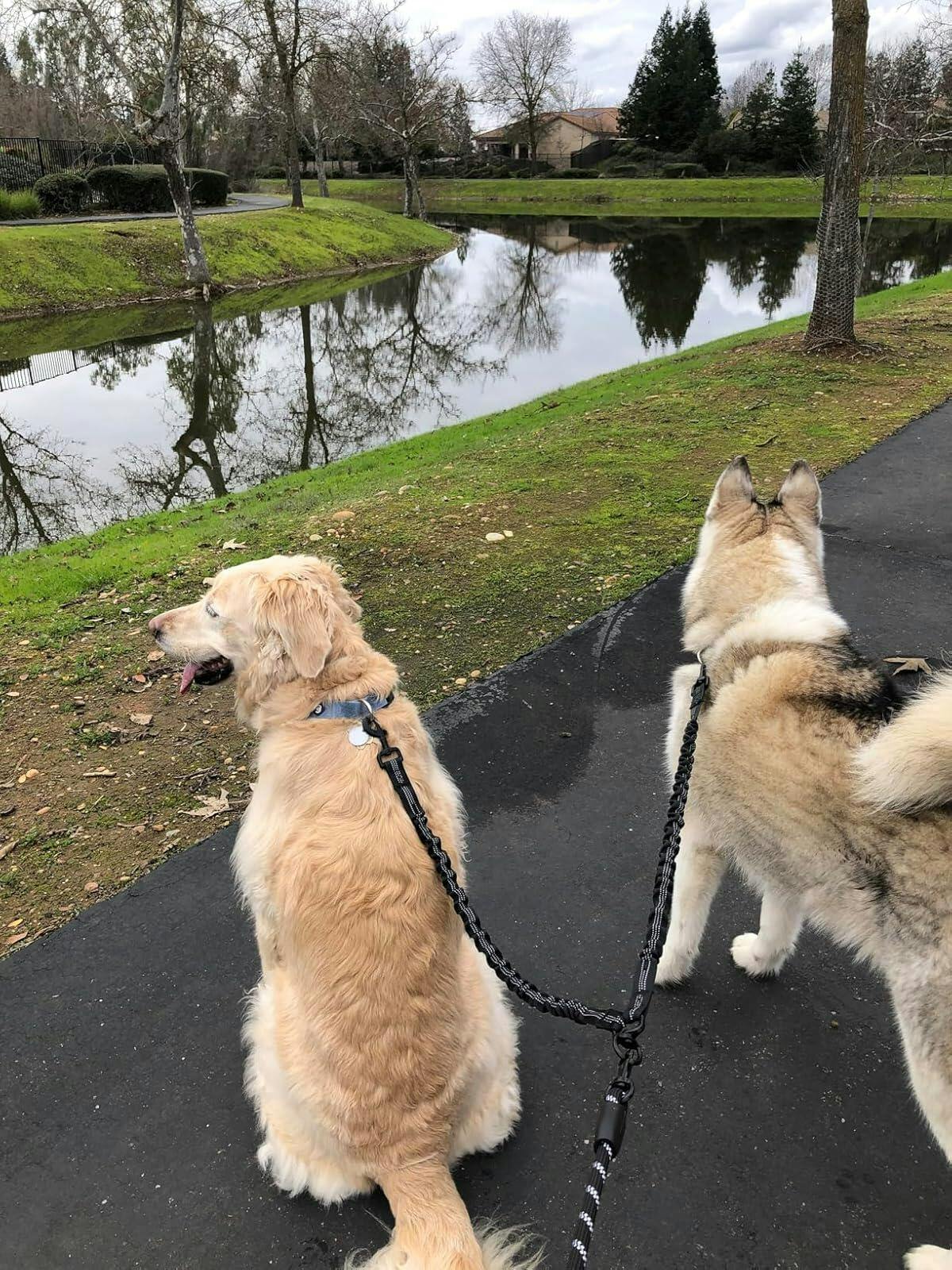 I have a rottweiler and a great dane/pitx that love walks. I tried taking them 1 at a time, but it never worked bc the one getting left at home was super unhappy and the pouting was professional level. I tried walking them with 2 leashes and that worked but was a pain with the tangling and was just not my favorite. I found this leash and ordered it - arrived in 1 day! Now I can walk them both at the same time and not have to worry with tangling and juggling leashes. I love the bungee and the swivel features.